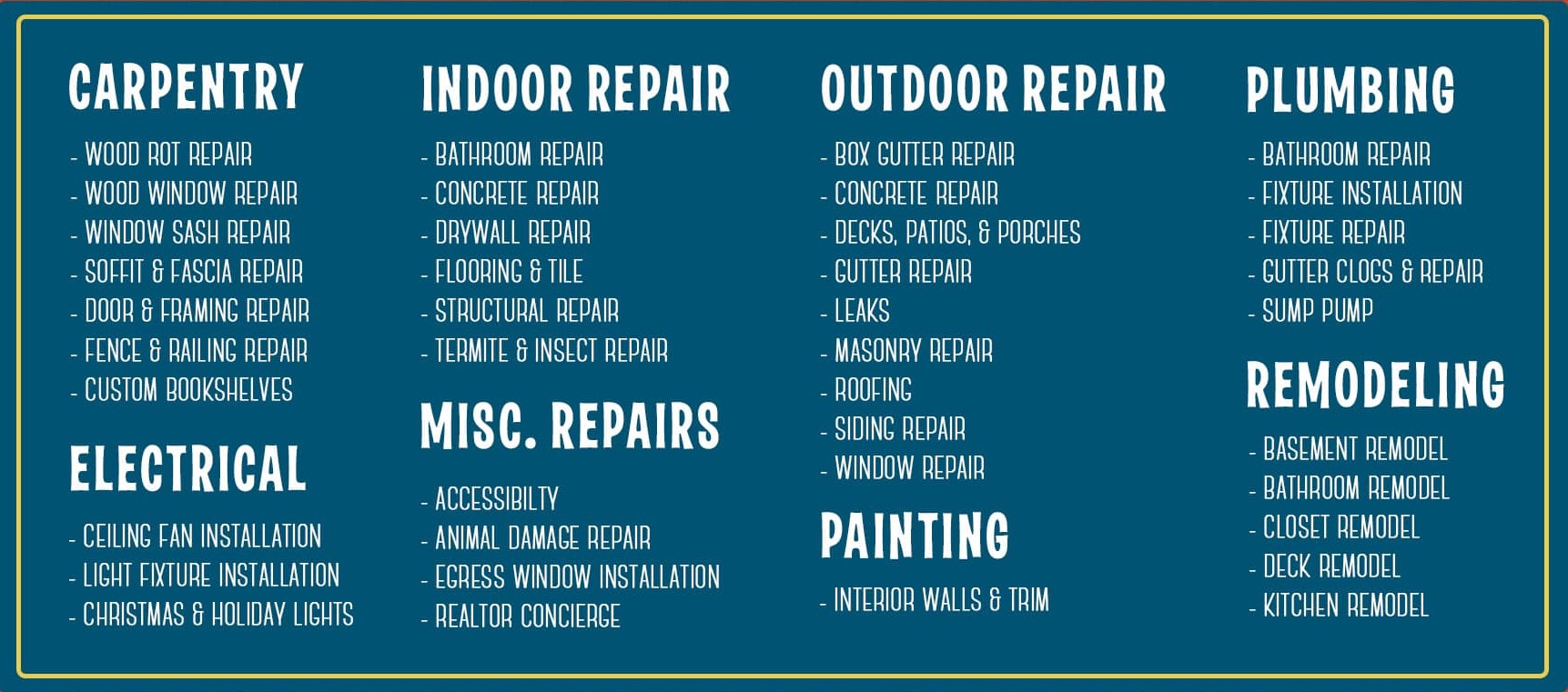 You’ve got a list of things to upgrade and fix around your house but you don’t know where to start. No worries – our team is here to help! We offer general repairs, carpentry, painting, and drywall services to make your home look and feel new. Don’t stress about the hassle of DIY – let our experts take care of it for you. Contact us today to schedule your appointment!